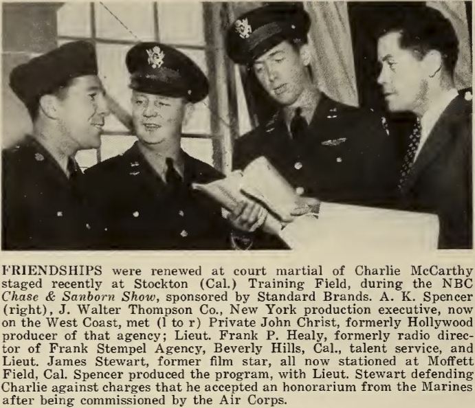 On earlier shows that season, Charlie McCarthy had joined the Army Air Corps, but then also tried to join the Marines. So, on this show Charlie was being court-martialed at the Stockton Army Air Corps Advanced Flying School in Stockton, CA. Lt. James Stewart was brought in to defend him.