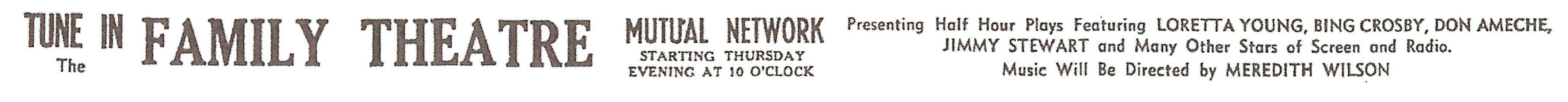 The Family Theatre premiered on the Mutual Network on February 13, 1947, with the play Flight From Home starring Loretta Young. Jimmy Stewart was on hand as the master of ceremonies. As outlined in Jimmy Stewart on the Air, he is heard only at the beginning and ending of the program and did not act in the play itself.