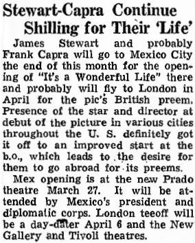 Two articles, both appearing in the March 12, 1947, edition of Variety, also have Stewart and Frank Capra visiting Texas, Mexico City and London.