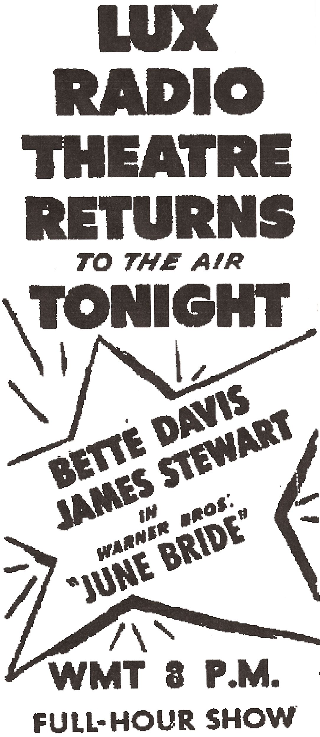 June Bride had been a 1948 film starring Bette Davis and Robert Montgomery. When it was produced by the Radio Theatre on August 29, 1949, Miss Davis reprised her film role as Linda Gilman, but the Montgomery role of Carey Jackson was filled by Jimmy Stewart. Co-starring with these two were Betty Lynn as “Boo” (also her film role; who can ever forget Betty Lynn as Thelma Lou, Barney Fife’s girlfriend on The Andy Griffith Show), Raymond Roe reprising his film role as Bud, Rhonda Williams as Jean, Eleanor Audley as Paula, Bill Johnstone as Mr. Brinker, Ruth Perrott as Mrs. Brinker, Herbert Butterfield as Carlton, Eddie Marr as Scotty, Holland Morris, Charlotte Lawrence, Noreen Gammill, Donald Randolph, Jane Webb and Joy Terry.