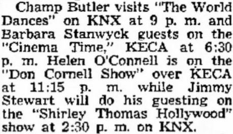 Shirley Thomas was a Hollywood reporter for NBC Radio and also hosted her own weekly half-hour program. As listed in Jimmy Stewart on the Air, Jimmy appeared on the July 26, 1953, broadcast. Here is a listing from the Independent Press-Telegram, Long Beach, CA, on the day of the broadcast.