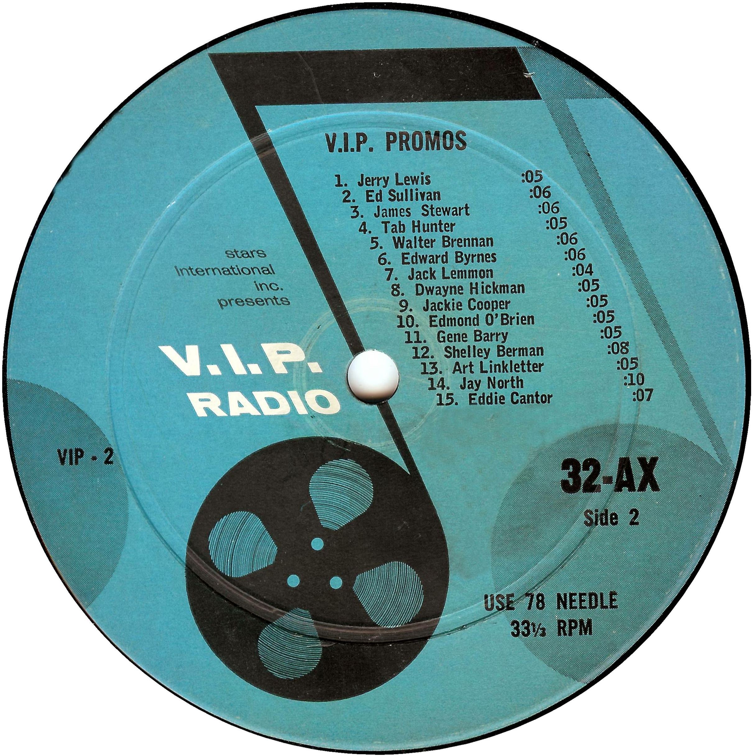 V.I.P. Radio was a 1950’s radio subscription service whereby Stars International Inc. would provide various celebrity announcements to local radio stations to help them promote their stations. Mr. Stewart appeared on many of these recordings. On this particular disc, V.I.P. Promos (32-AX), the stars simply identify themselves and remind the listener that they are listening to V.I.P. Radio.