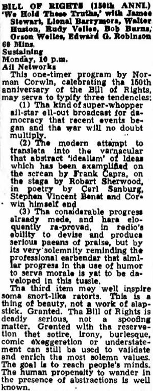 As detailed in Jimmy Stewart on the Air, We Hold These Truths was commissioned by President Franklin D. Roosevelt to mark the 150th anniversary of the ratification of the Bill of Rights. Famed radio man Norman Corwin was the writer, producer and director of the program and Bernard Herrmann wrote the musical score. Corporal Jimmy Stewart, on special leave from the military to act as narrator, an ordinary American citizen. In the photo below we see the cast and crew: